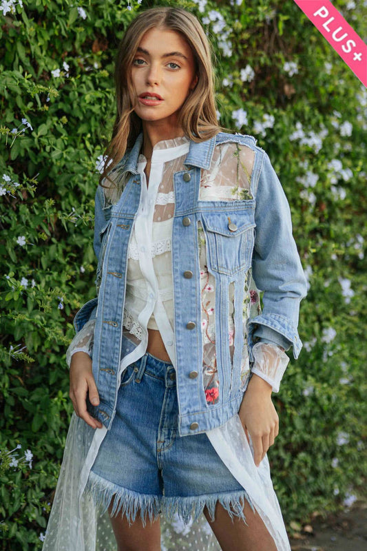Davi & Dani Floral Embroidery Mesh Denim Jacket