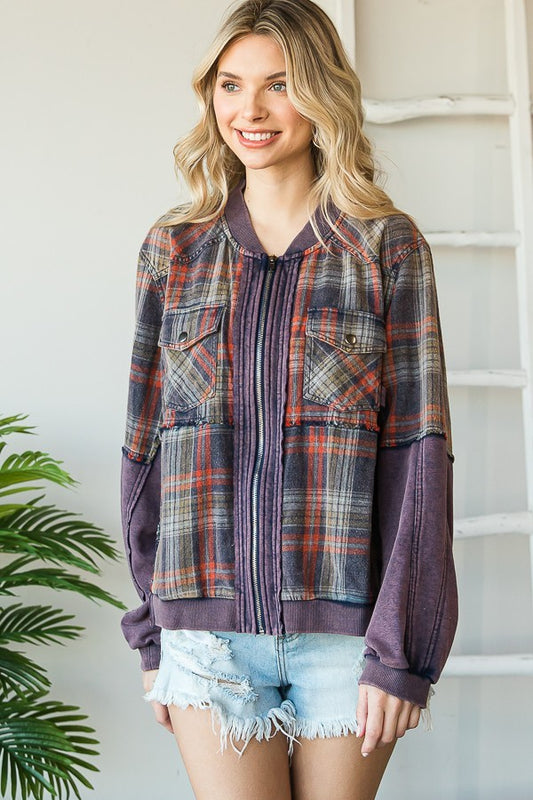 Oli & Hali Washed Media Plaid Zip Front Jacket