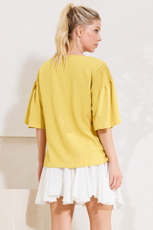 Umgee Satin V-Neck Short Ruffle Sleeve Top