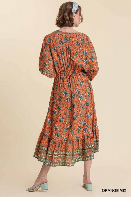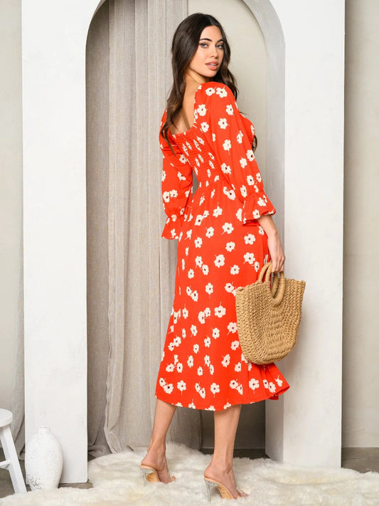SUGAR + L!PS Red Ivory 3/4 Sleeves Smock Floral Midi Dress