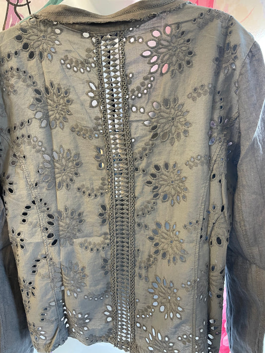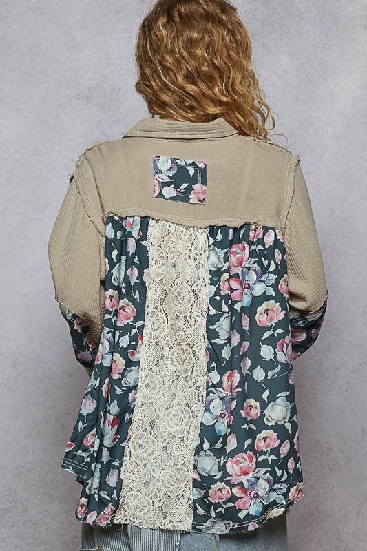 Pol Ballon Sleeve Twill With Lace Trim Floral Detail Jacket Top