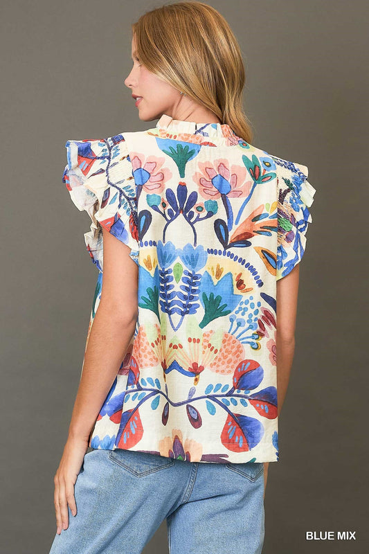 Umgee Split Neck Smocked Floral Print Ruffle Sleeve Top