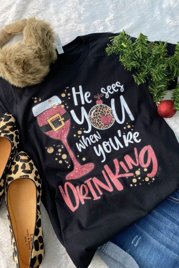 HE SEES YOU WHEN YOUR DRINKING Soft CHRISTMAS Graphic T-shirt