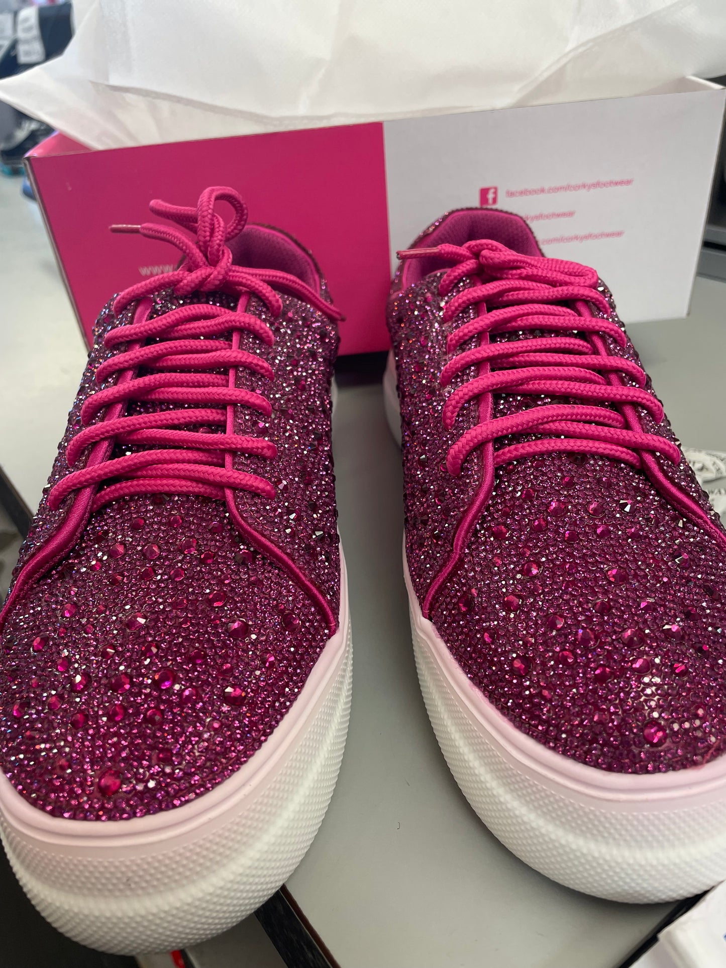 Elevate your casual wear with these stunning rhinestone sneakers! They feature a sparkling rhinestone upper with a 1.5" white rubber outside, lace up design, and an incredibly comfy, cushioned insole.
