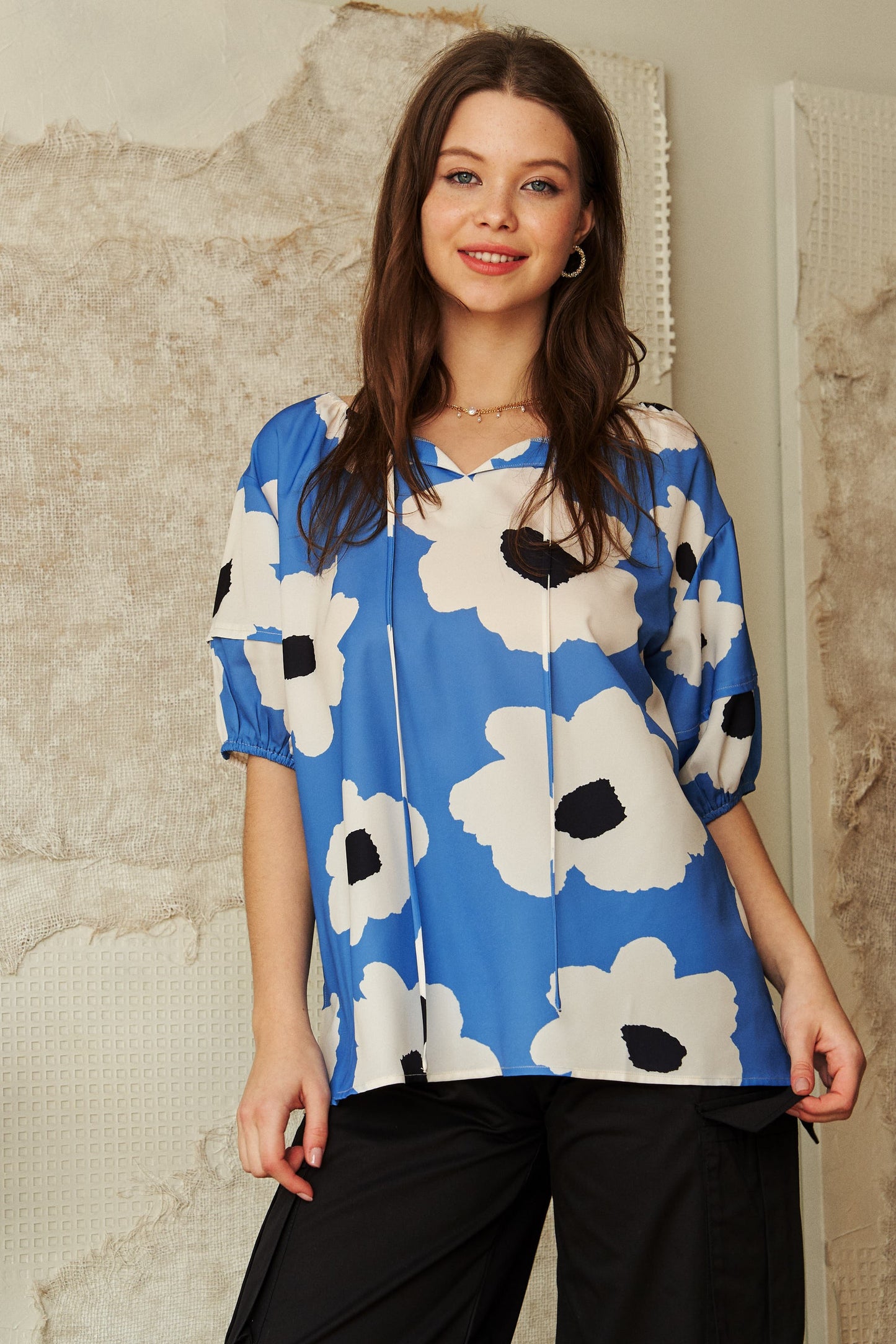 Davi & Dani Floral Tie Front Puff Short Sleeve Blouse
