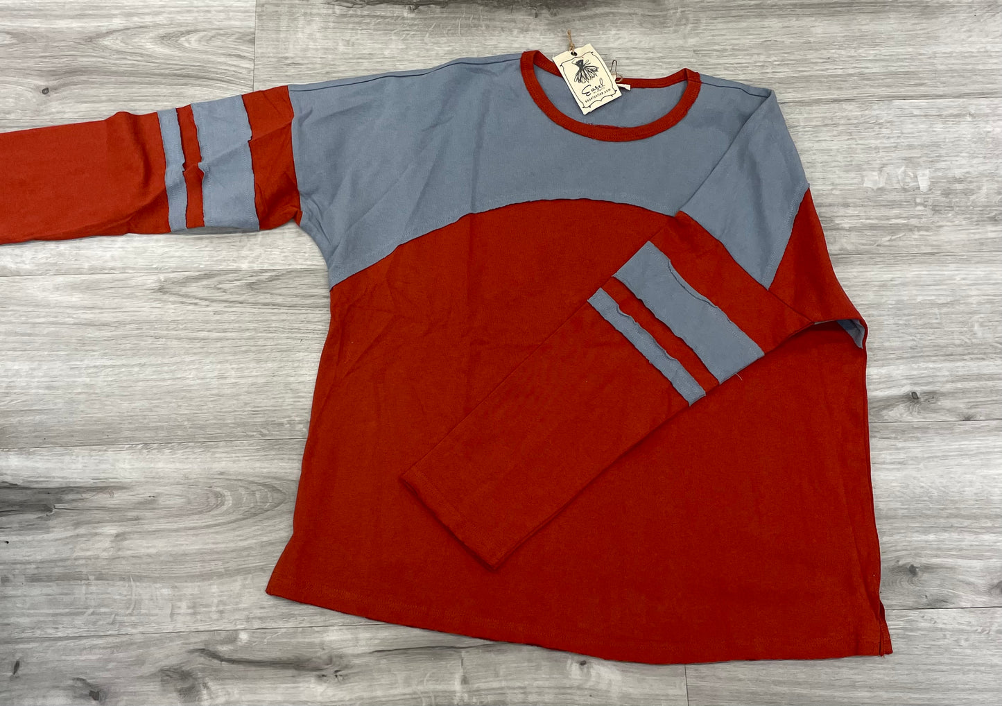 COLOR BLOCK LOOSE FIT TOP -ROUNDED NECKLINE -COLOR BLOCKED TOP -LOOSE FIT AND BOXY SILHOUETTE -SIDE MINI SLITS