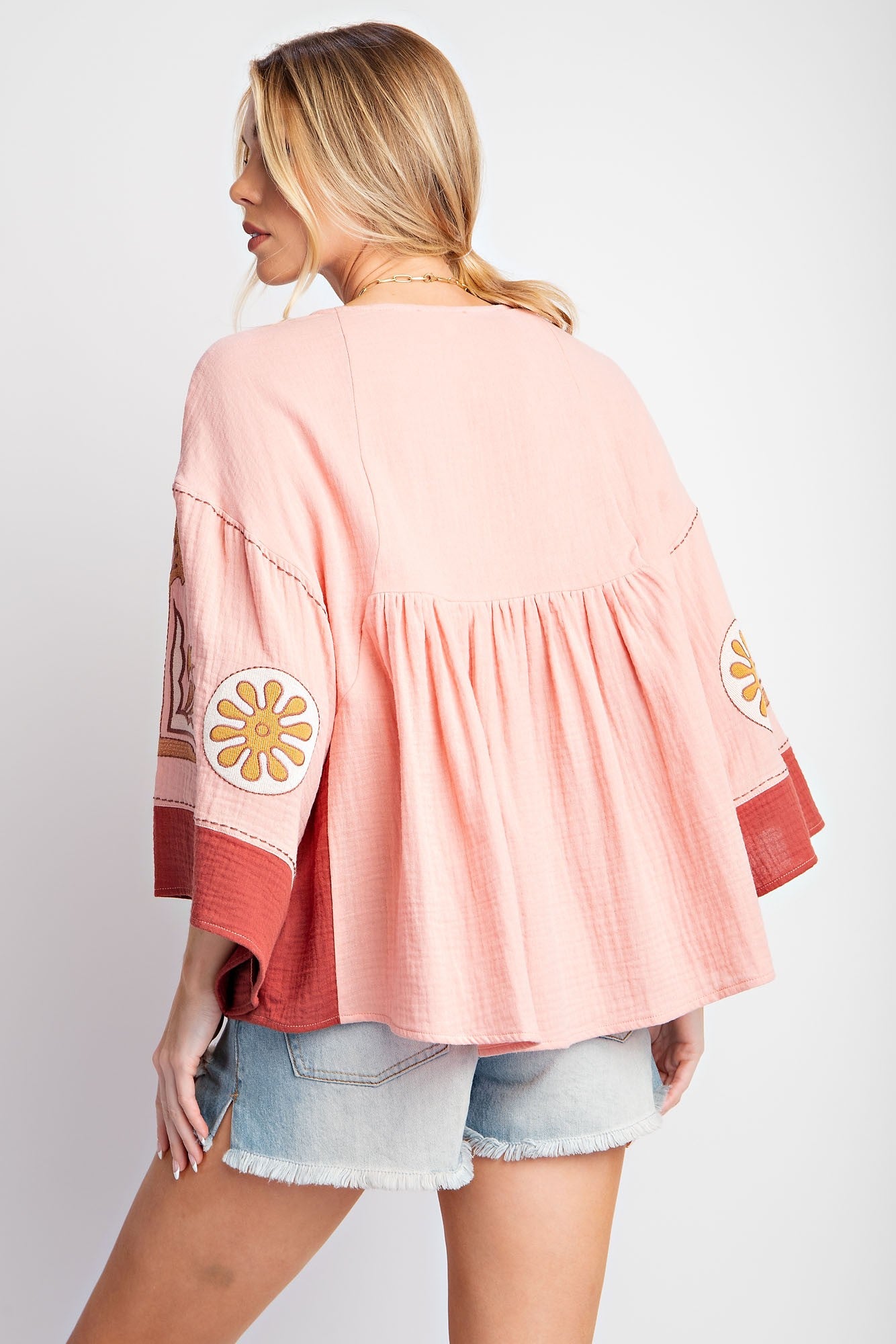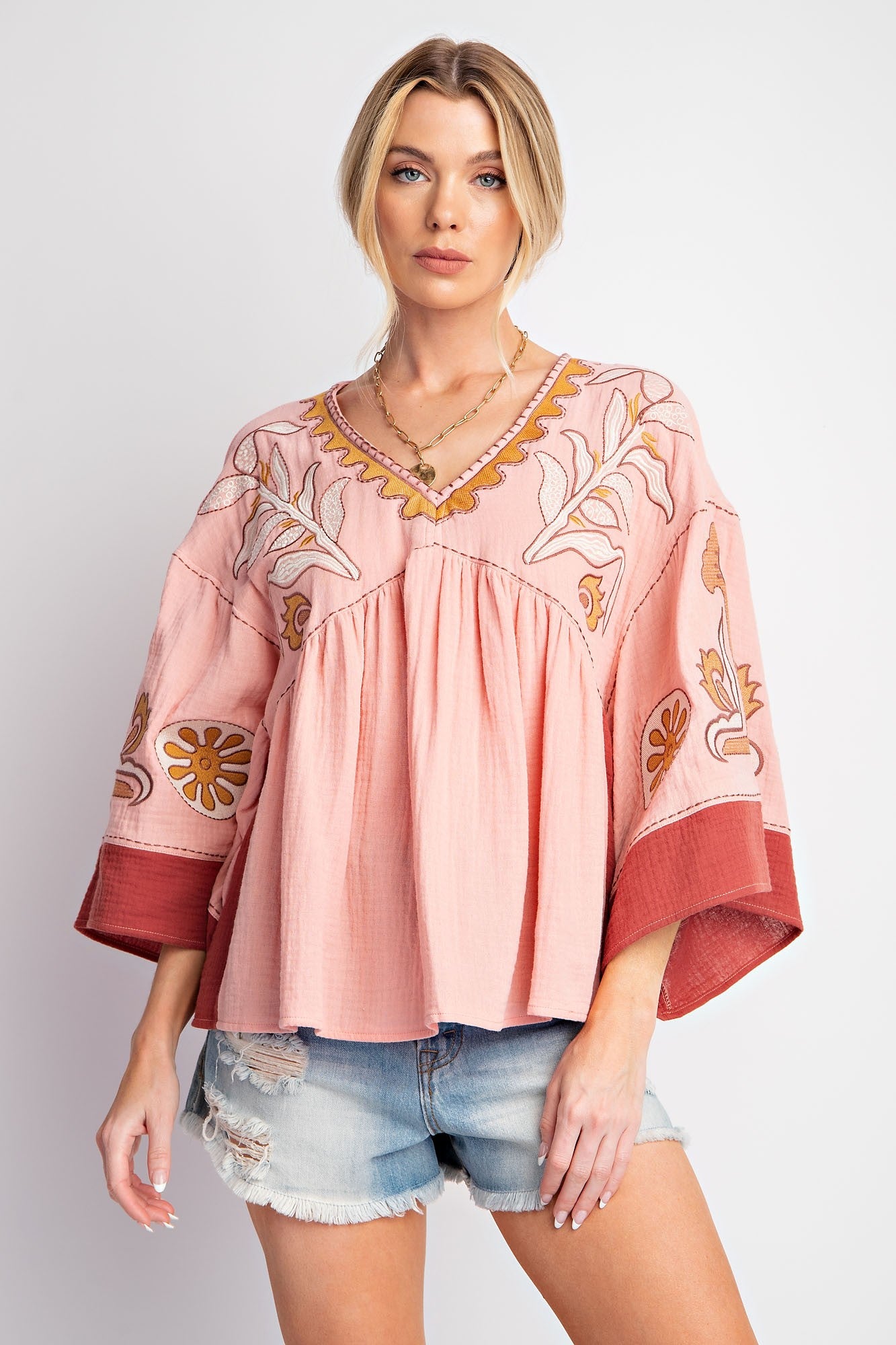 EMBROIDERY DETAILING COTTON GAUZE BABYDOLL WOVEN TOP -V NECKLINE -DROPPED SHOULDERS -3/4 WIDE SLEEVES -EMBROIDERY DETAILING -RUFFLE BOTTOM -LOOSE AND SLIGHTLY OVERSIZED FIT -FLOWY SILHOUETTE