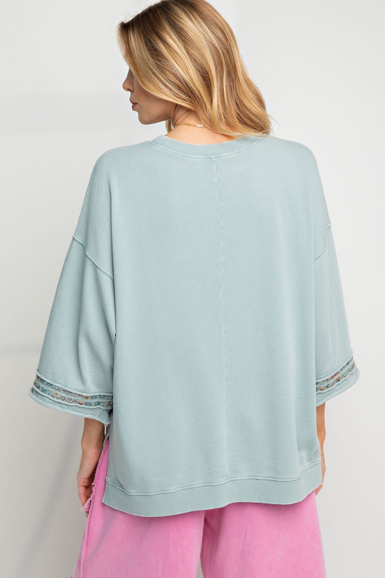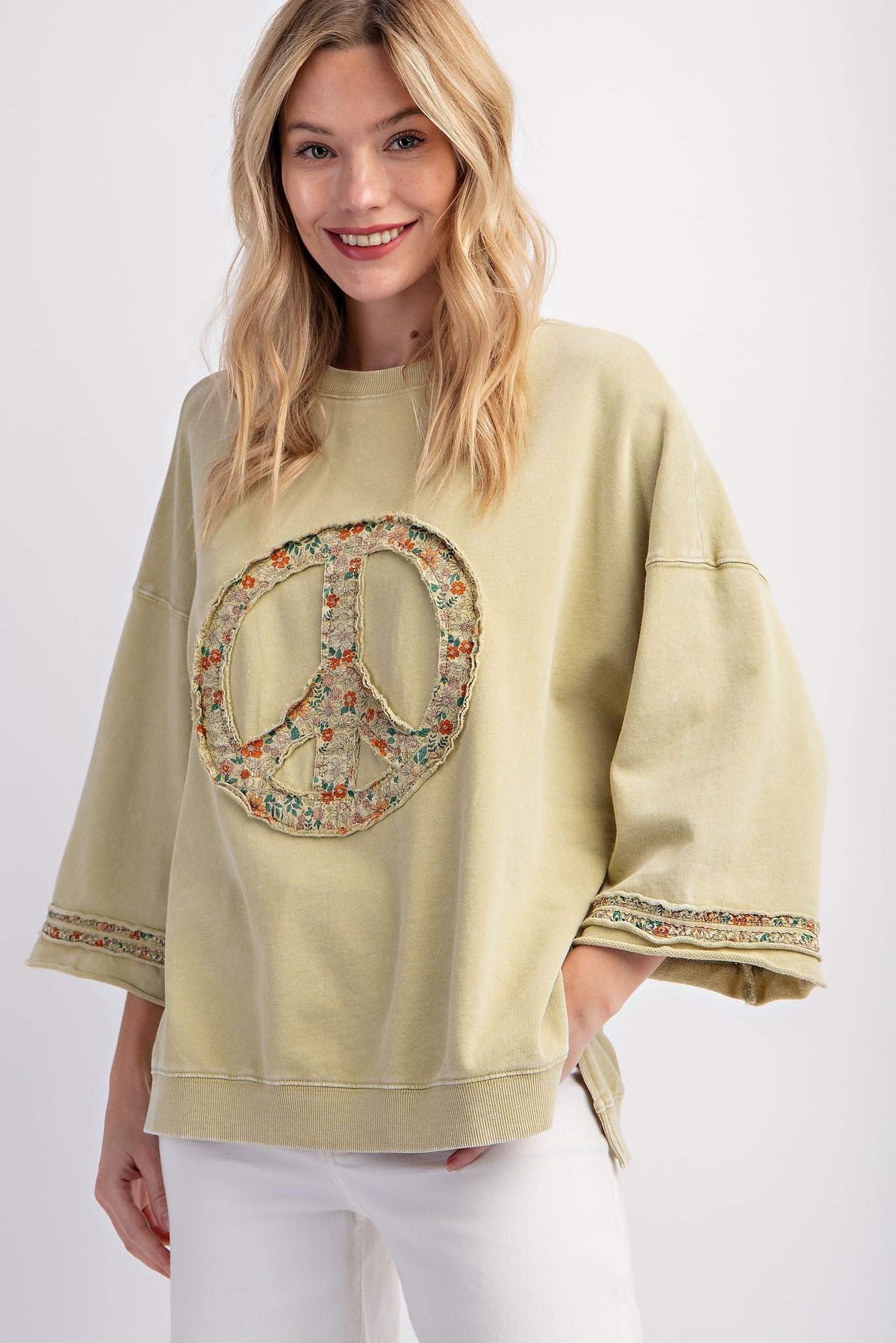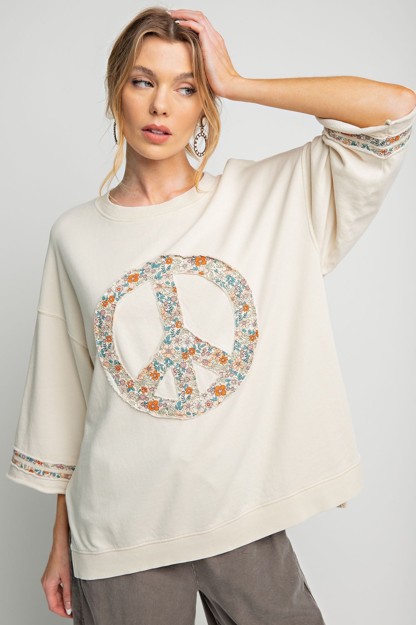 WASHED TERRY FLORAL PEACE SIGN PULLOVER -BOAT NECKLINE -3/4 SLEEVES -RAW HEM THROUGHOUT -FLORAL PRINT DETAILING -RIBBED EDGES -SIDE SLITS FOR ADDED SHAPE -OVERSIZED AND LOOSE FIT -BOXY SILHOUETTE