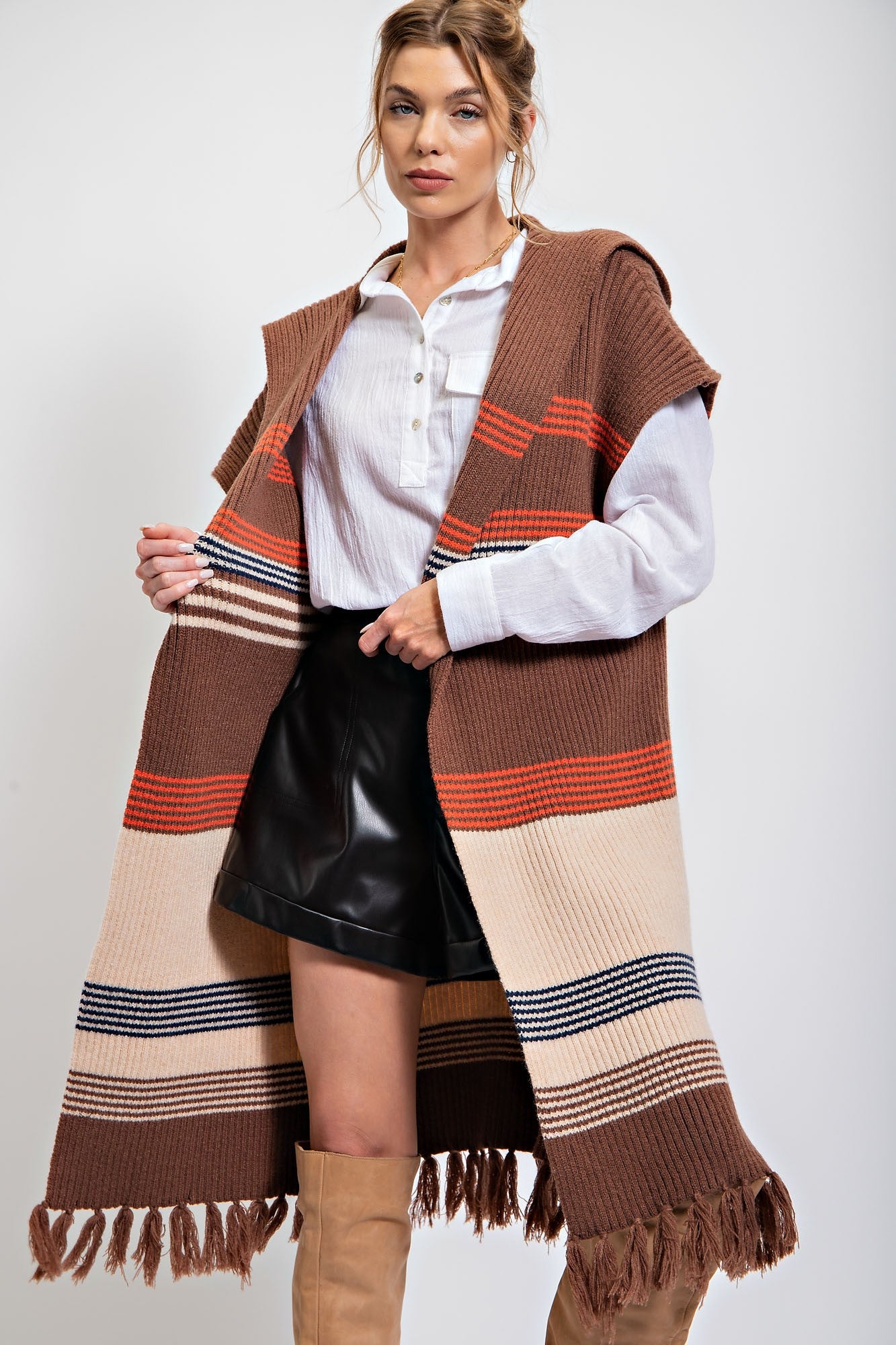 -KIMONO SLEEVES -STRIPE PATTERNED -ATTACHED HOOD -FRINGE DETAILING -OPEN FRONT -RELAXED AND LOOSE FIT