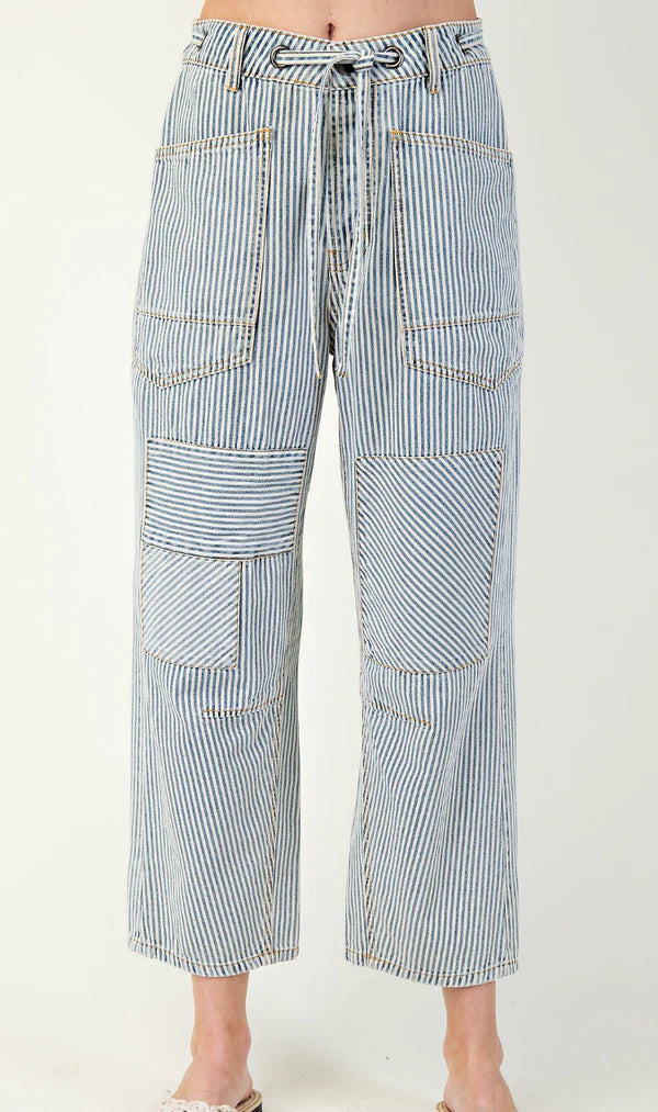Our Striped Washed Twill Pants combine comfort and style with a unique twist. Featuring belt loops with an adjustable drawstring for a custom fit, these pants also include front and back pockets for practicality. The contrasting striped patchwork adds a bold, eye-catching detail, while the straight-leg fit offers a sleek and flattering silhouette. Perfect for casual wear with a touch of modern flair.