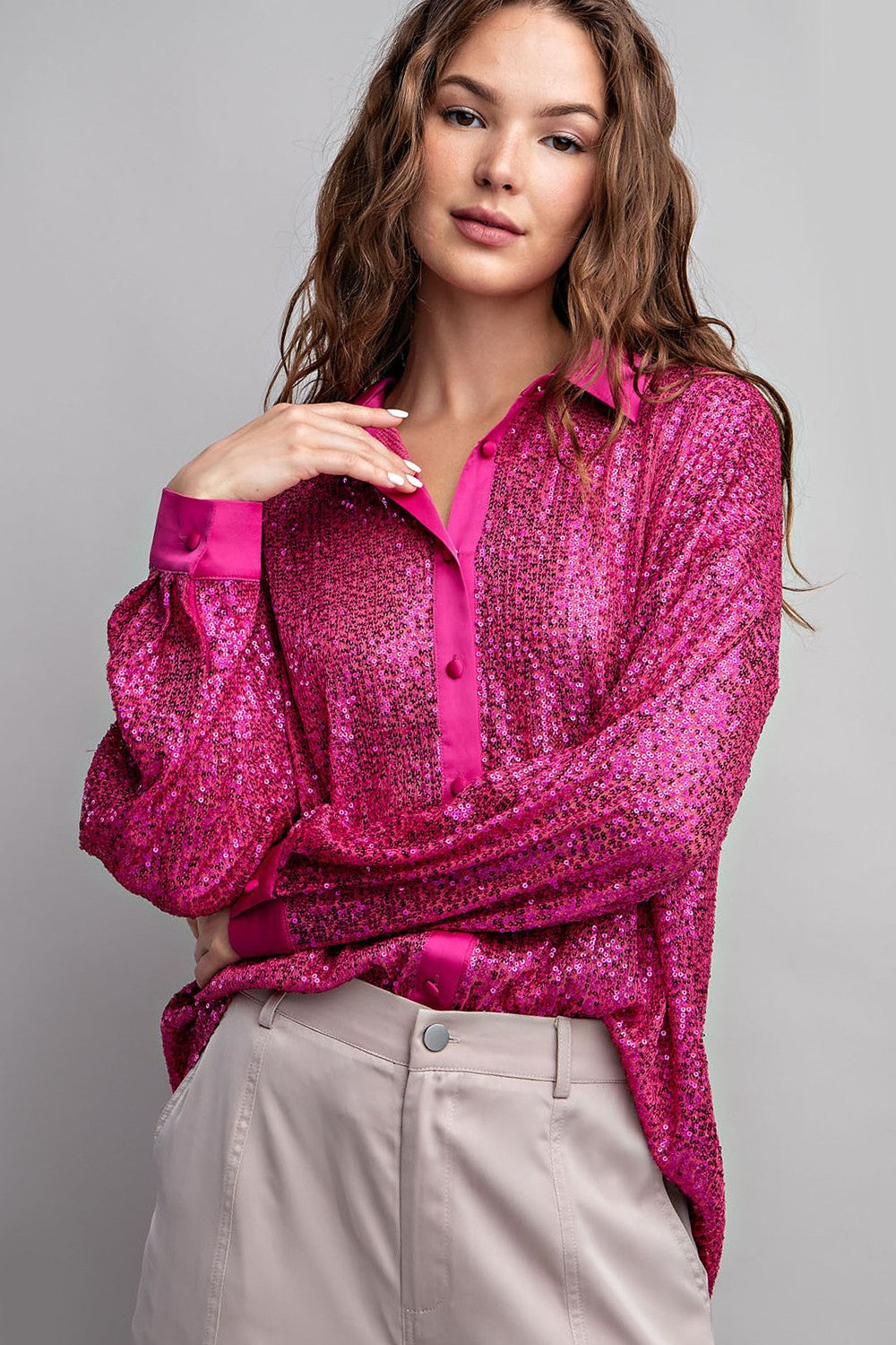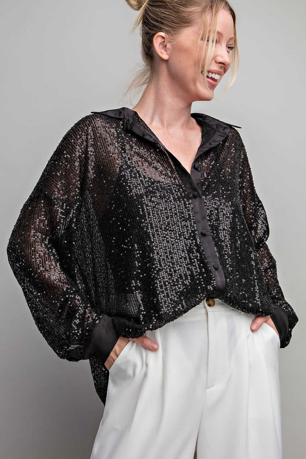 Sequin long sleeve shirt top featuring a satin button down front,