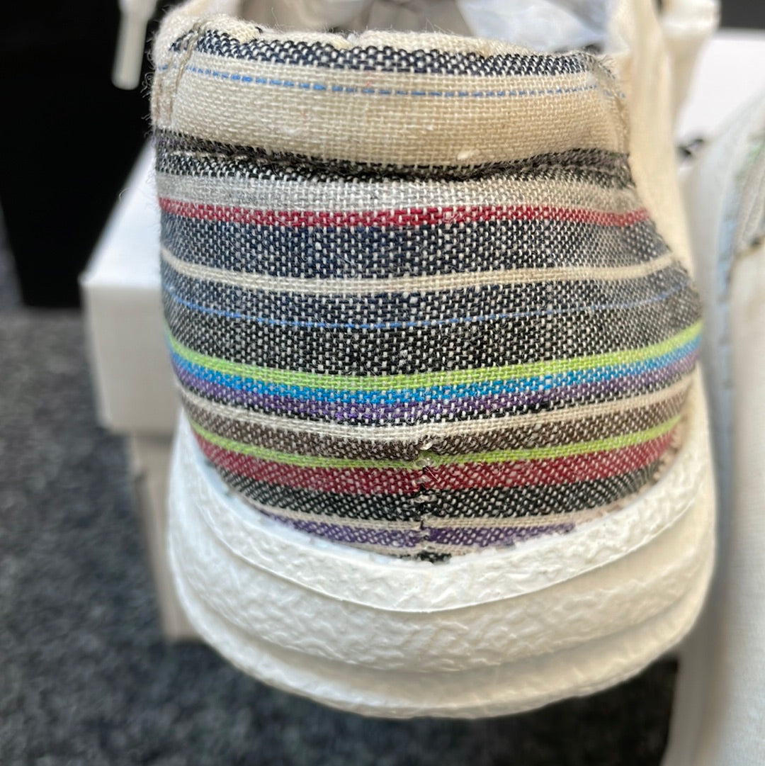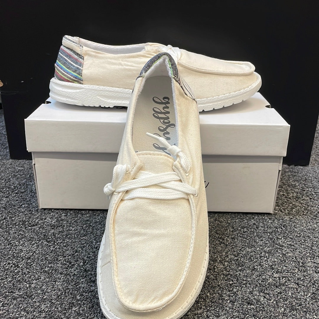 These cute & simple shoes are the perfect shoe to pair with your everyday Fall fashion! They are lightweight, have a flexible and cushioned sole, and a colorful striped pattern heel.