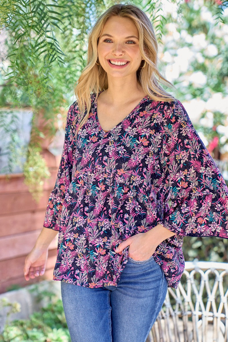 Hailey & CO Navy & Fuchsia Floral Babydoll Bell Sleeve Top