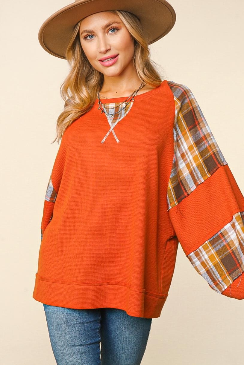 ROUND NECK SOLID THERMAL KNIT PLAID WOVEN COLOR BLOCK RAGLAN BUBBLE LONG SLEEVE LOOSE FIT OVERSIZED PULLOVER KNIT TOP WITH TRIANGLE DETAIL REVERSE STITCHED