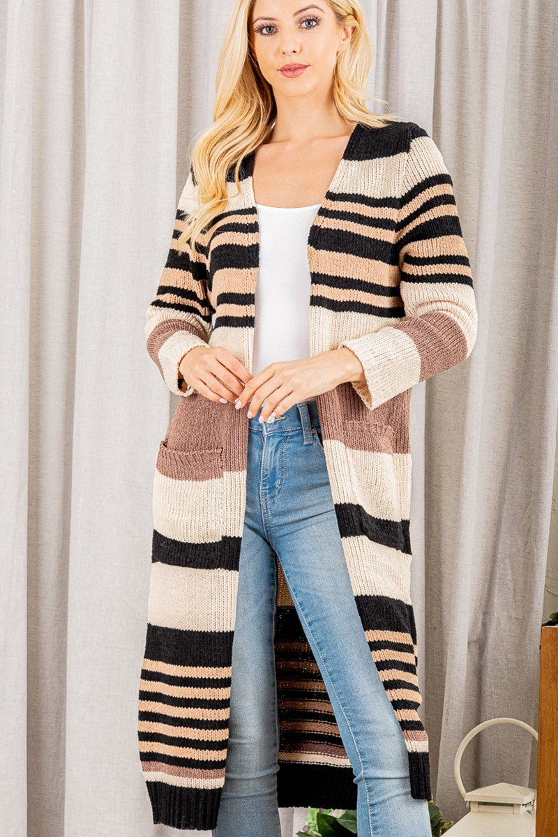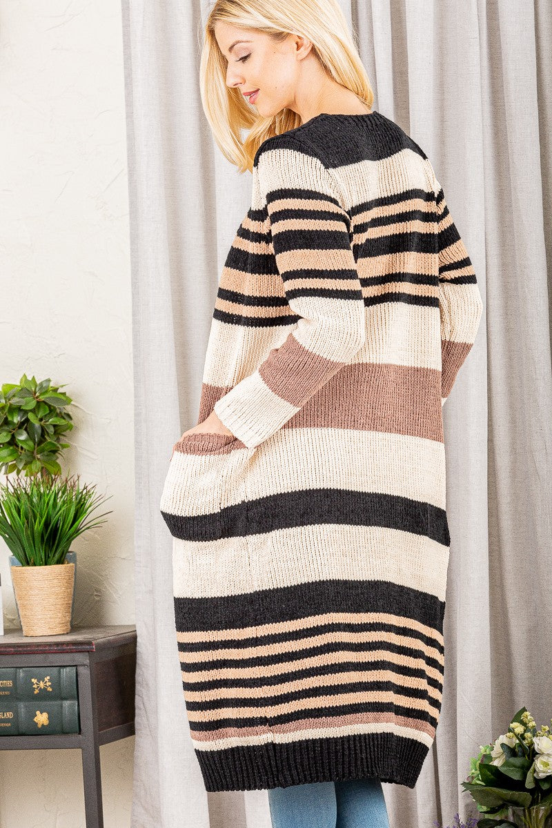 LONG SLEEVE MULTI COLOR STRIPE PRINT OPEN CARDIGAN WITH SIDE POCKET DETAIL