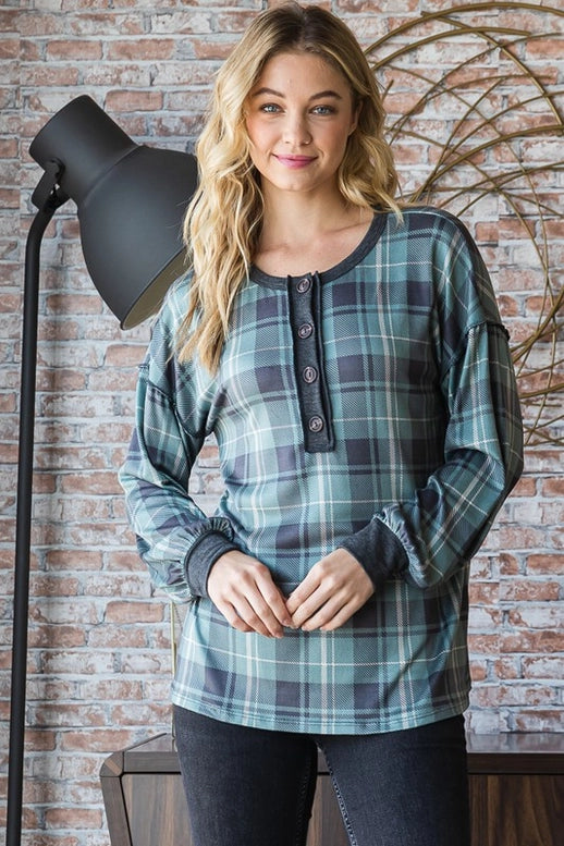 LONG PUFF SLEEVE ROUND NECK PLAID PRINT TOP WITH FRONT BUTTON DOWN AND CONTRAST BAND DETAIL "MODEL SIZE: HEIGHT 5'9"", BUST 34"", WAIST 24"", HIPS 36"" WEARING SIZE: SMALL"