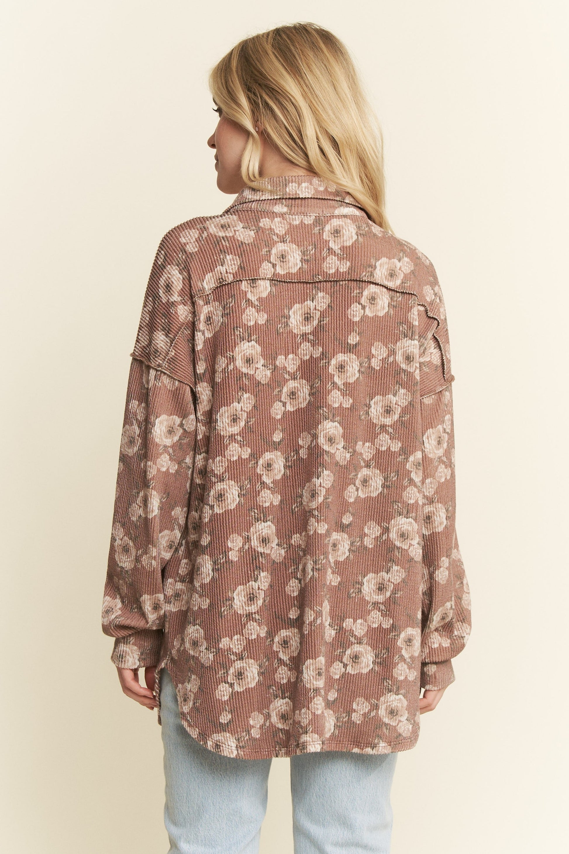 95% POLYESTER 5% SPANDEX LONG SLEEVE BASIC COLLAR NECK FLORAL URBAN RIBBED BUTTON DOWN SHACKET