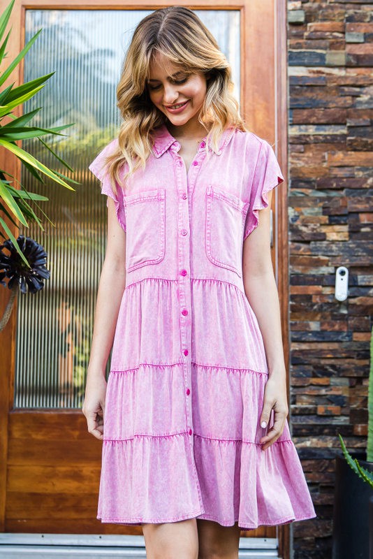 Washing solid dress with a collard neck, back pleated, ruffled shoulder, front pockets, and tiered skirt. - Button-front, non-sheer, lightweight. - Model is 5'8'' and is wearing a Small.