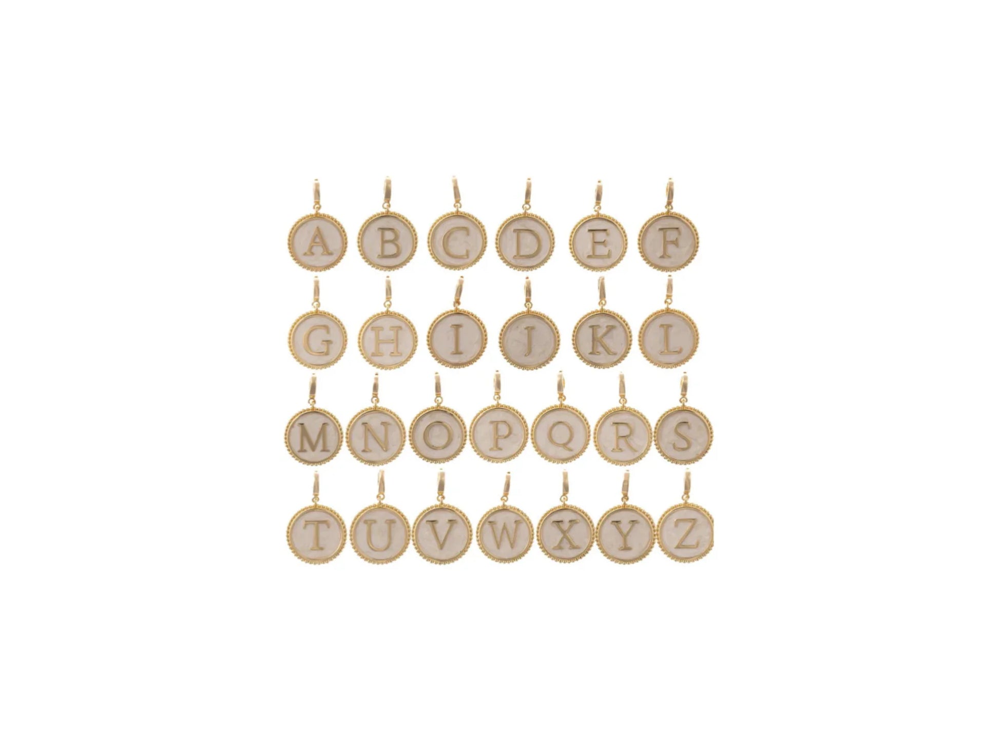 18k gold plated circular initial charm with faux mother of pearl inlay and clasp