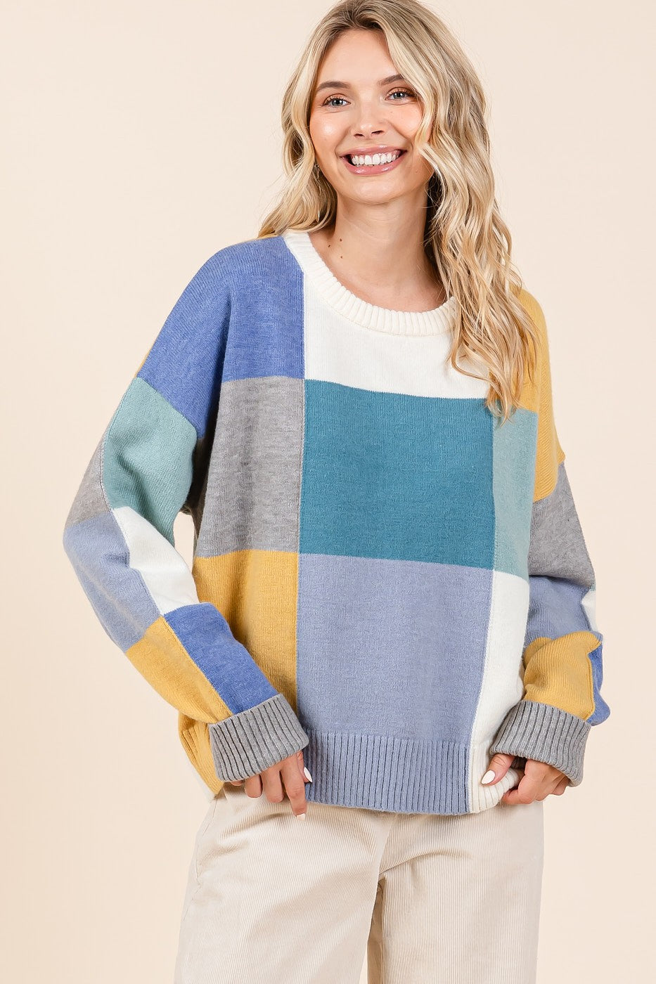 - MULTICOLOR COLOR BLOCK SWEATER KNIT FABRIC - ROUND NECK - DROP SHOULDER - LONG SLEEVE - RIBBED BAND AT NECKLINE, HEM, AND CUFFS - RELAXED FIT MODEL IS 5'8" AND WEARING SIZE SMALL # fall, winter, knit sweater, pullover, outerwear, loose fit, rib knit,