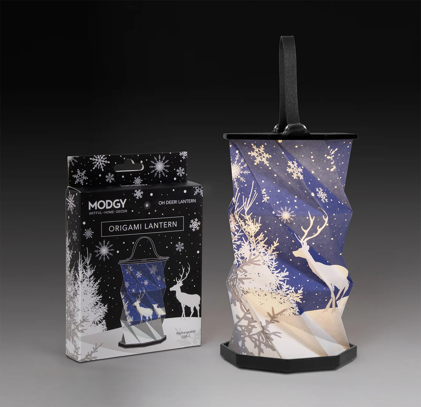 Modgy Origami Lanterns are beautiful and fun way to enhance any décor or event. Origami Lanterns are rechargeable and fold flat, then expand to three different sizes. They emit a warm, dimmable light and come with a carrying/hanging strap and a USB-C charging cord.