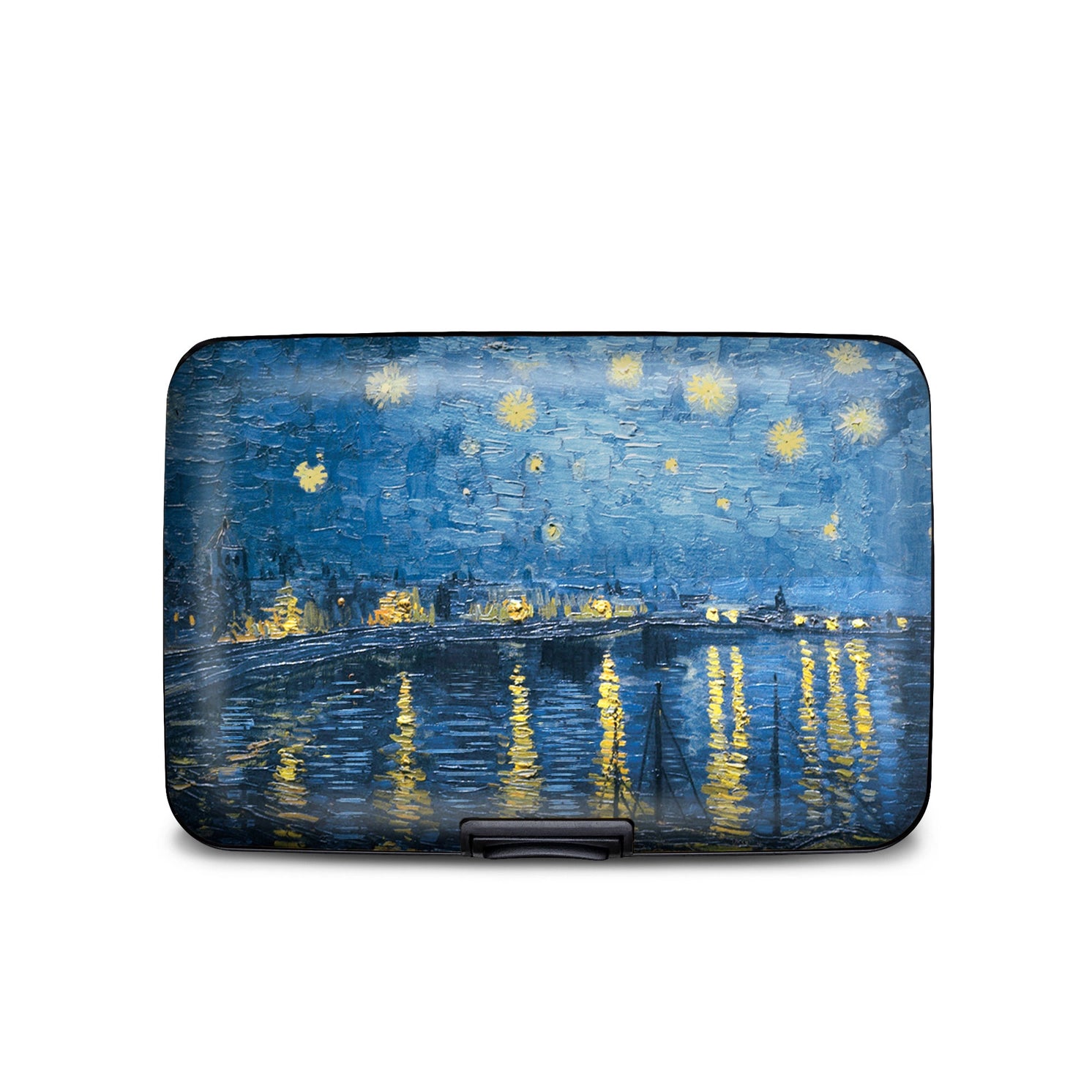 sturdy aluminum wallet featuring a strong closing clasp and a tear resistant fabric interior accordion that holds up to 6 personal cards. The RFID blocking technology will protect against identity theft. 4.5 inch wide x 3 inch tall x 0.75 inch thick