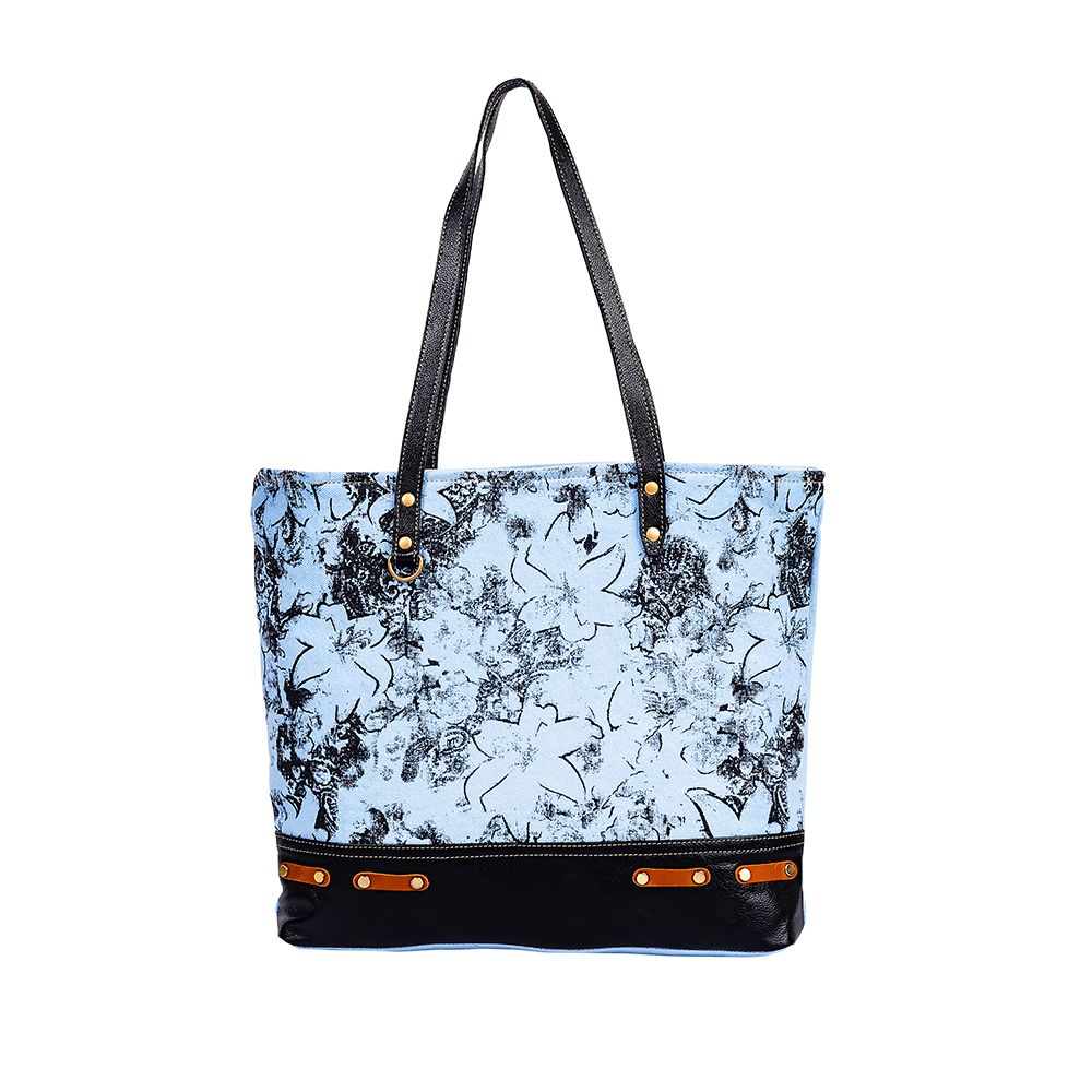 This lovely bag will be a sure favorite! The front features the gorgeous floral pattern in the upcycled woven canvas in a wonderful blue color. There's plenty of room for everything in the spacious interior. The back is our sky blue upcylced woven canvas with extra zipper. Zipper-close top and durable carrying straps in ebony leather complete the harmonious look. You'll love your look!