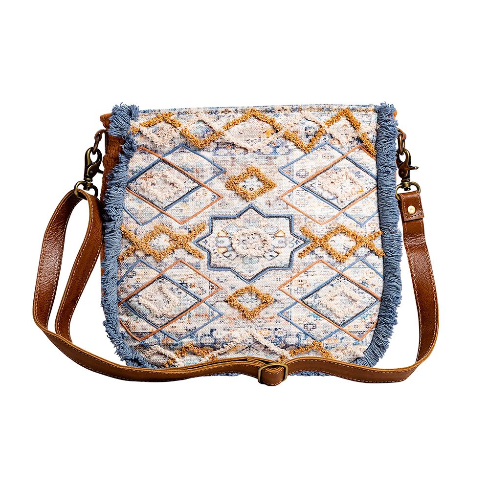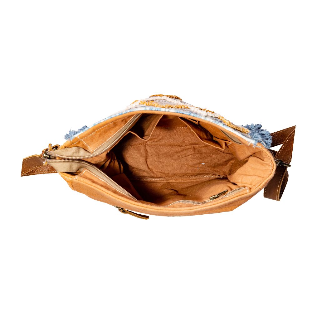 With a bit of vintage charm, this lovely bag offers enchangting style! The lovely pattern of the the upcycled rug is enhanced with careful embroidery and stitching to add depth and dimension. The sides and back are a wonderful woven caramel canvas; a zippered pocket on the back adds convenience. Zipper-close top. Durable, adjustable shoulder strap in chestnut leather completes the look.