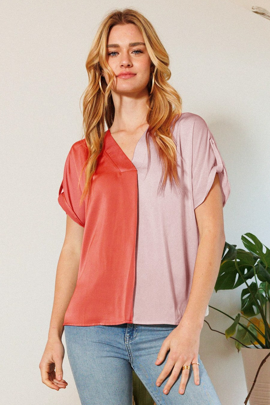Color blocked woven satin blouse featuring v-beck, pleated tack-front,