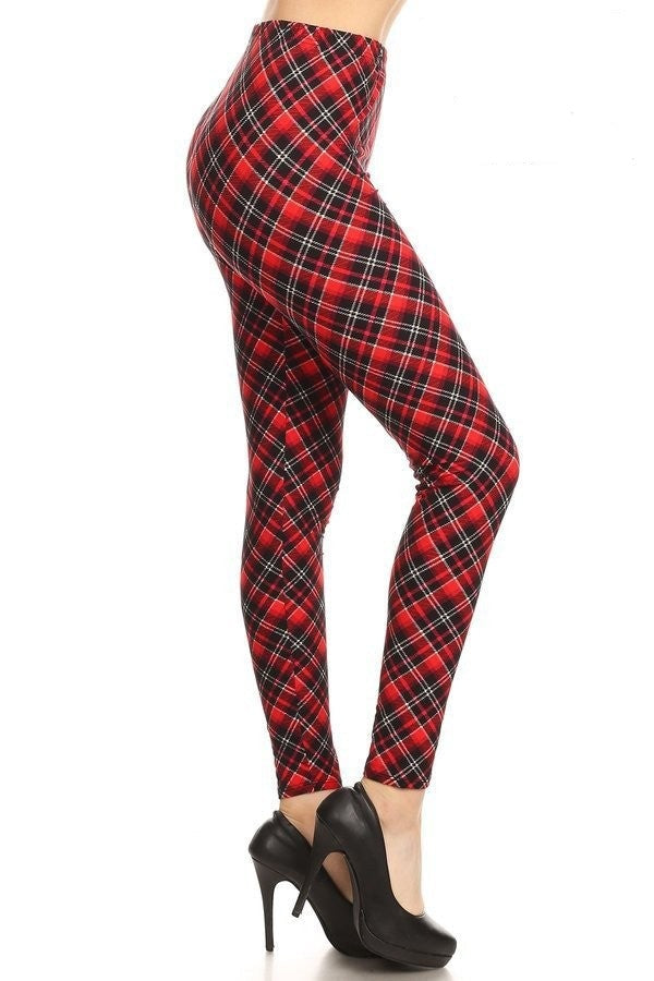 red and black plaid, high waisted full length leggings with an elastic band. One Size,