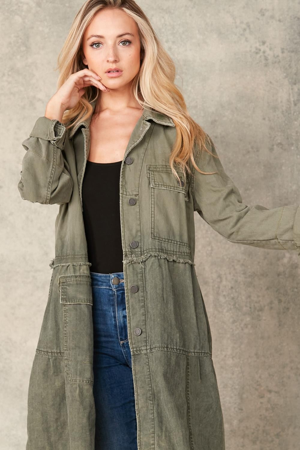 PLUS SIZE COTTON BUTTON DOWN CUT EDGE LONG SLEEVE TIERED JACKET WITH POCKETS