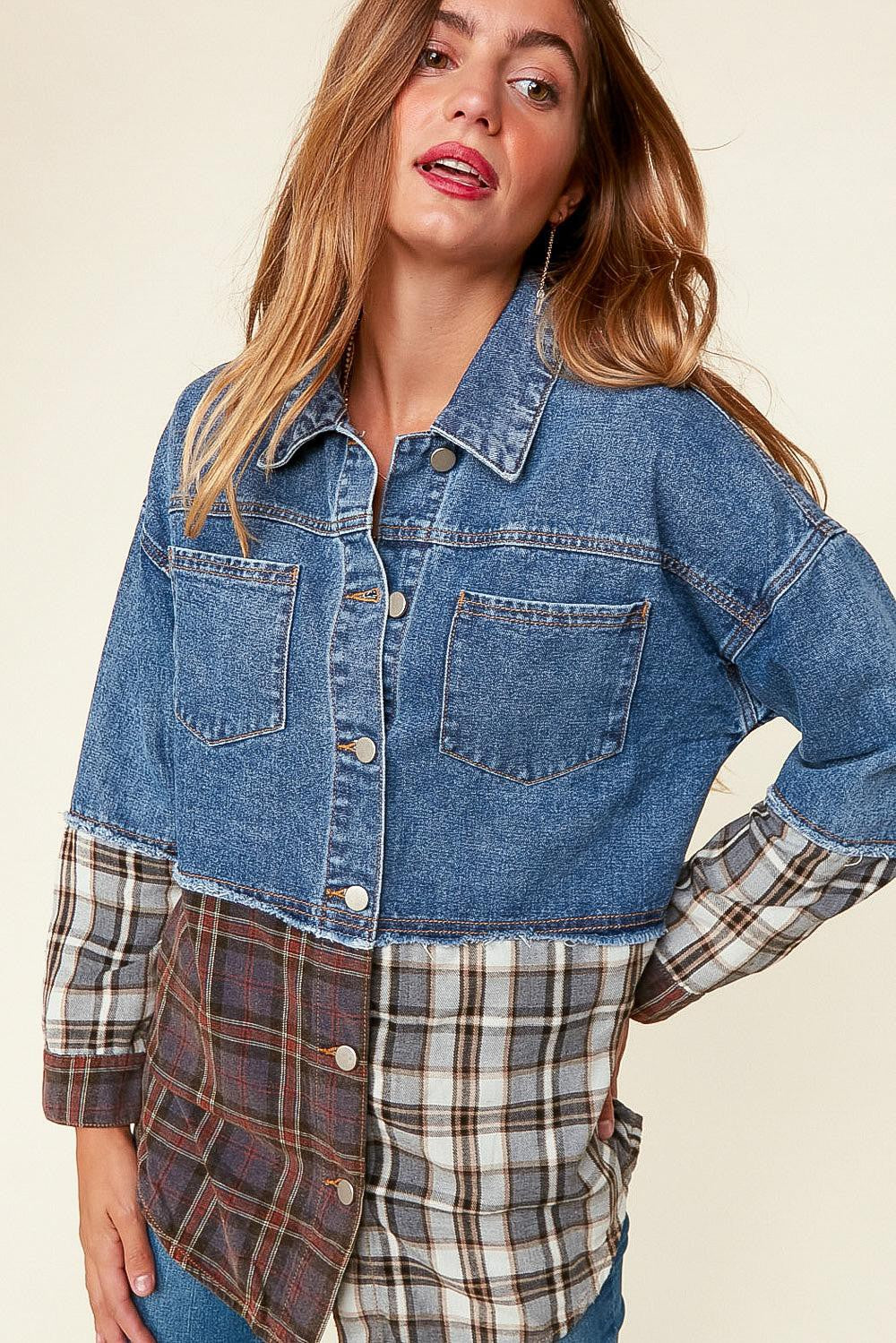 Sugarfox Washed Denim Plaid Color Block Shacket