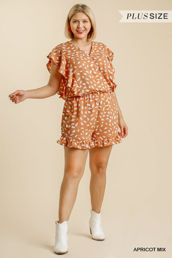Umgee Apricot V-Neck Dalmatian Print with Short Romper Ruffle Trim.