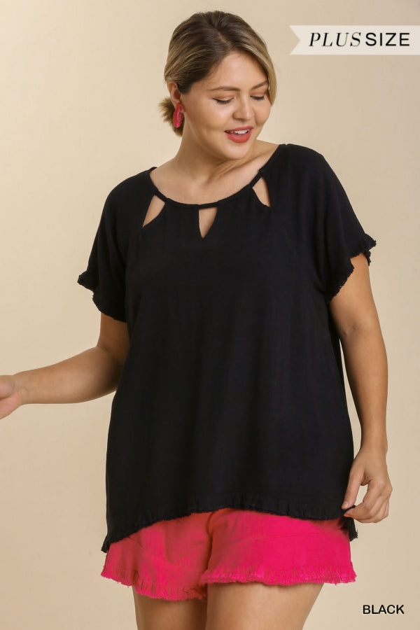 This Umgee linen blend top has a frayed fringe hem and a cut out round neckline.