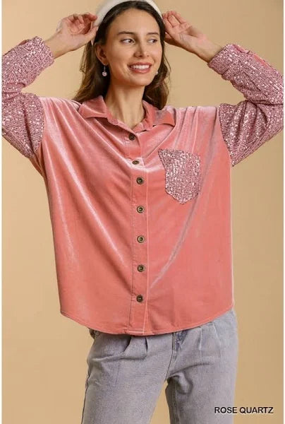 Umgee Rose Velvet Button Down Sequin Sleeves & Pocket