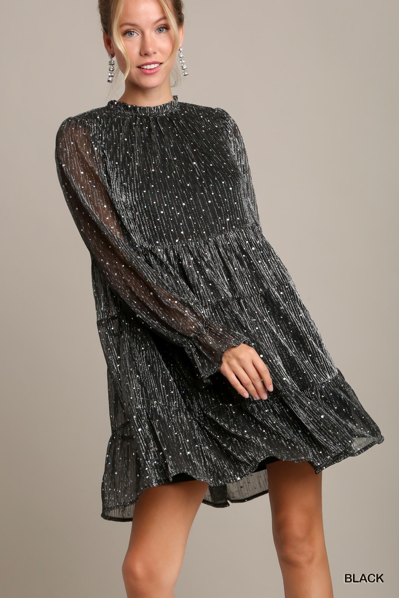 Frilled Neck Puffed Long Sleeve Rhinestone Embellished Tiered Detail Skirt Metallic Baby Doll Mini Dress