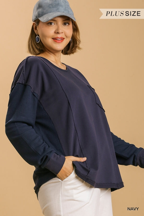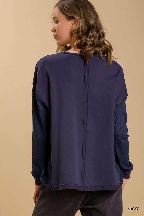 Umgee Round Neck Top with Waffle Knit Long Sleeve