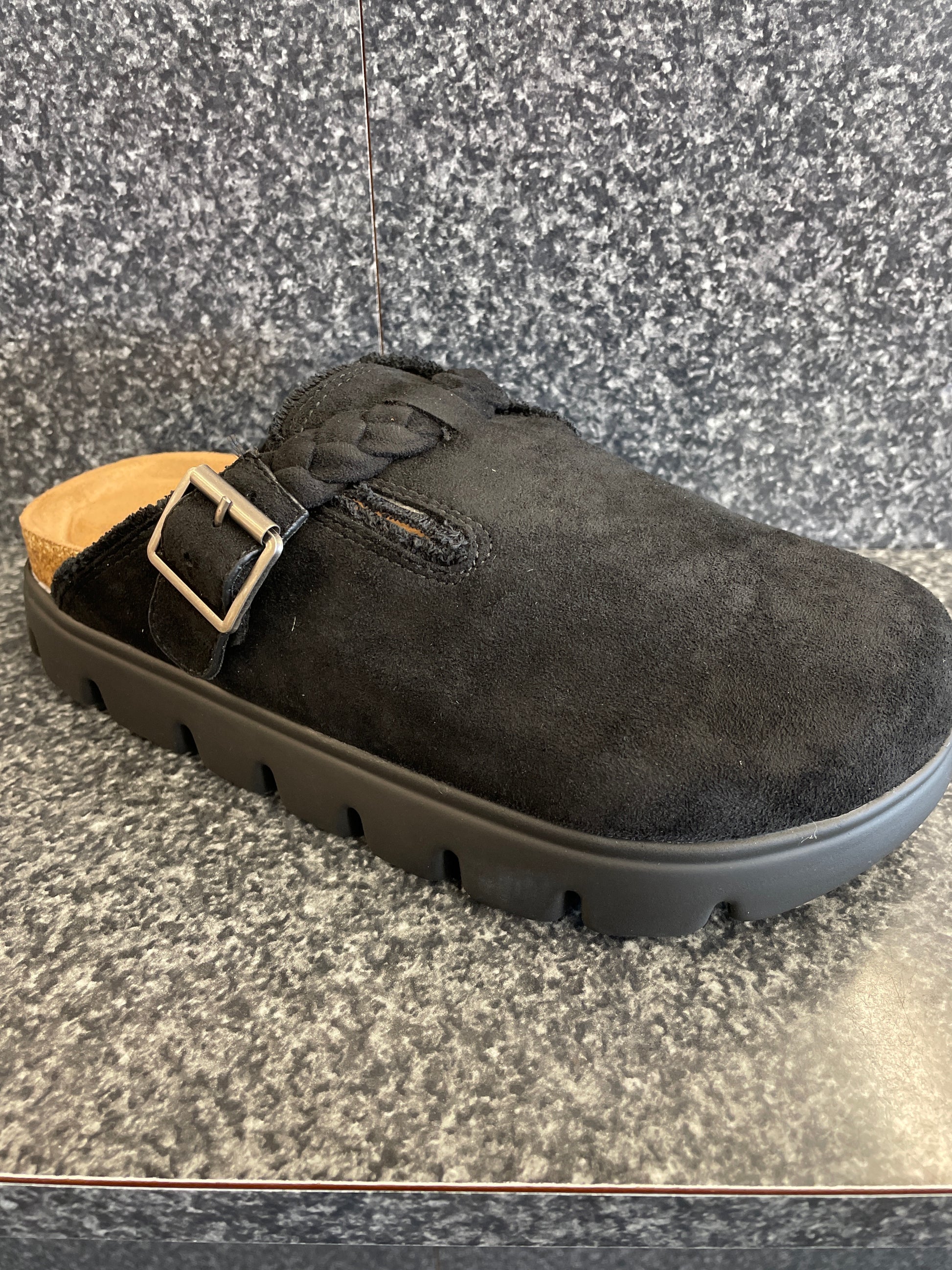 Very G women's Cali platform slide. Casual slip on clogs made of tan suede with a cozy textured finish. Chunky white rubber sole giving a trendy sporty aesthetic. The top features a braided suede strap with metal buckle, combining comfort & style perfect for everyday wear. Pair with denim, joggers or casual dresses.