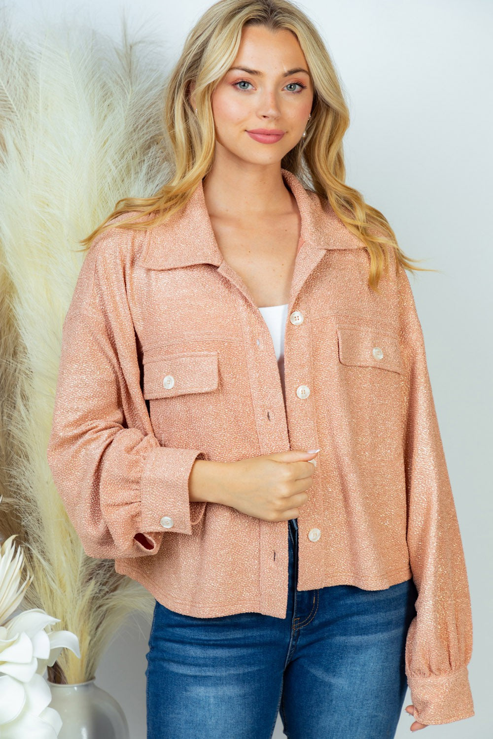 A long sleeve metallic knit top with a collared button-up front featuring pockets and a relaxed fit. Fabric is a lightweight lurex knit. Model is 5'7" and is wearing a size Small.