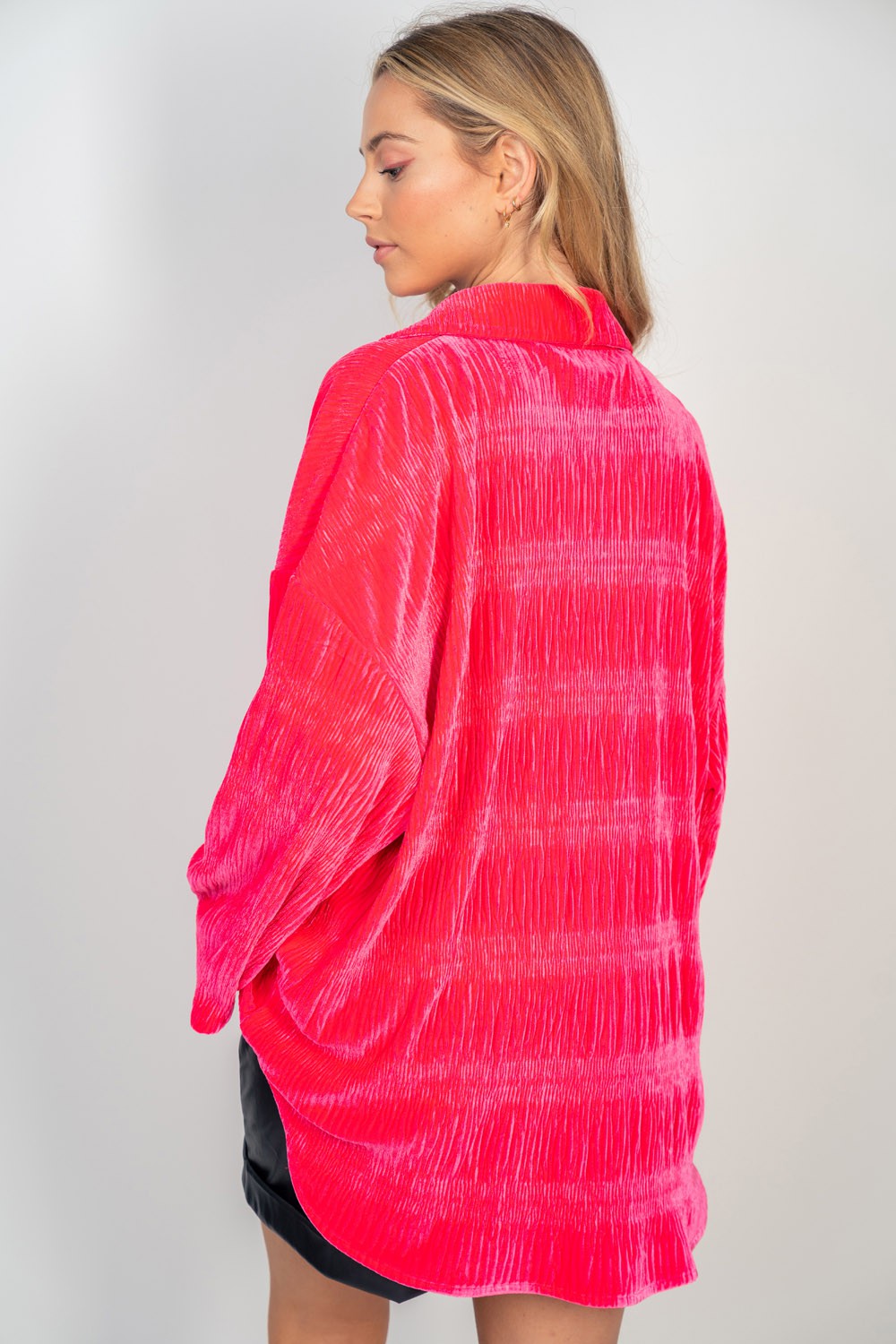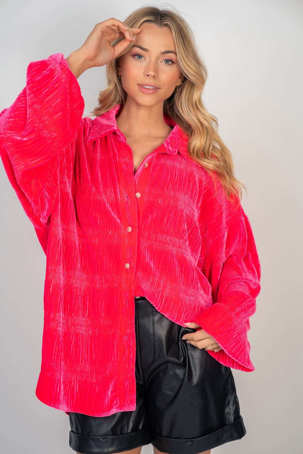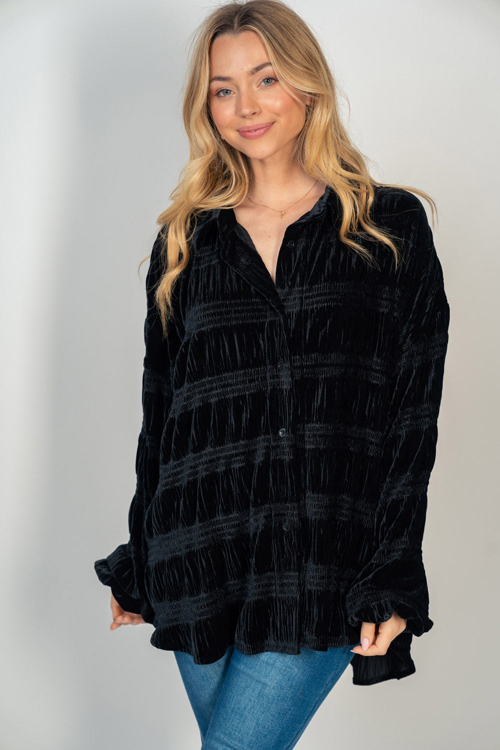 A long sleeve solid velvet knit top with a button down front featuring a relaxed fit. Fabric is a lightweight velvet knit. Model is 5'7" and is wearing a size Small.